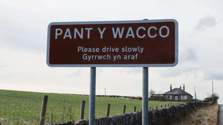 Pant Y Wacco, Flintshire; UK: Feb 11, 2021: A place name sign at the entrance to the village of Pant Y Wacco incorporates a bilingual Welsh and English message which asks motorists to please drive slowly