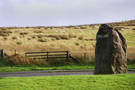 England landscape with rock sign, fence and sheeps