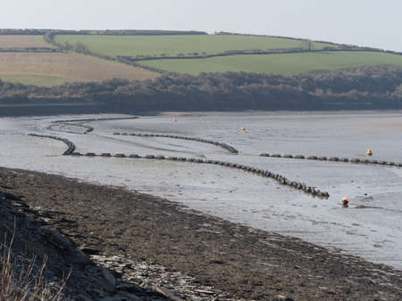 Mussel beds and cages exposed at low tide on the Camel Estuary,Cornwall