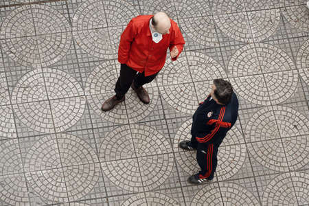 Jakarta, Indonesia - October 2022: two men walking on the wide sidewalk