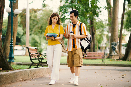 College students walking home after classes and discussing project