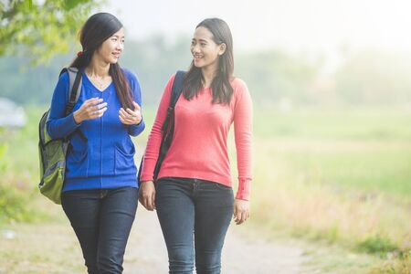 two woman outdoor walk in sunny summer day