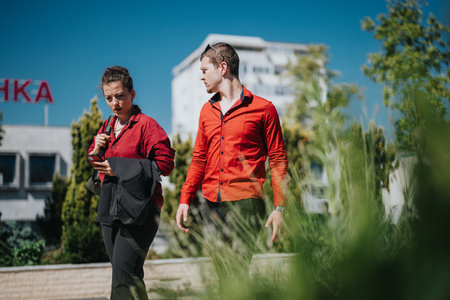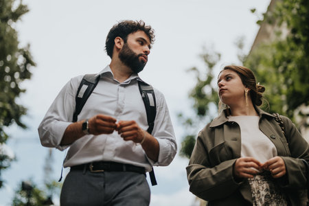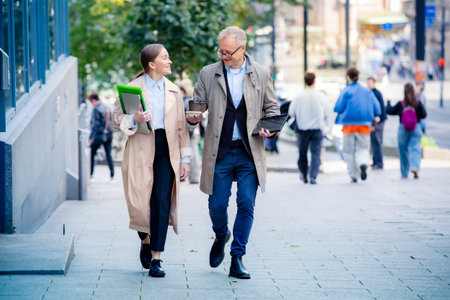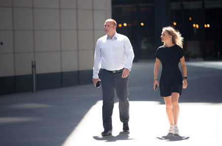 Business professionals walking in the city while having a conversation on a sunny day