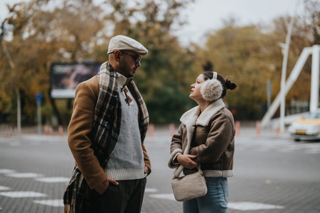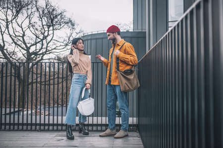 Young man and woman in casual clothes talking outside