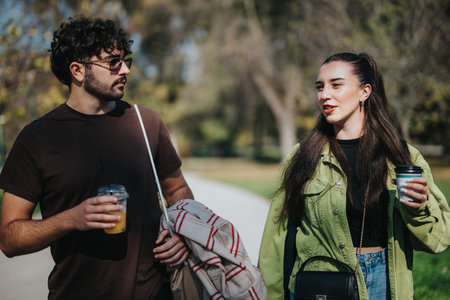 Young friends enjoying a walk with coffee in a sunny park