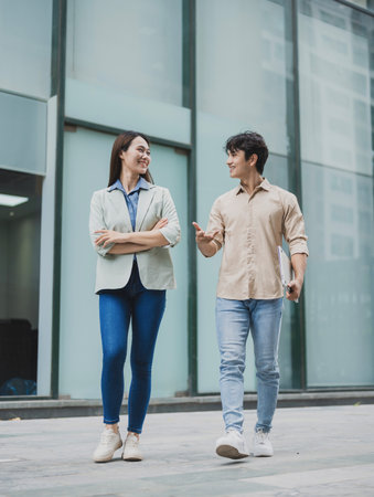 Two young business colleagues discussing business while walking outside office.