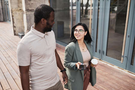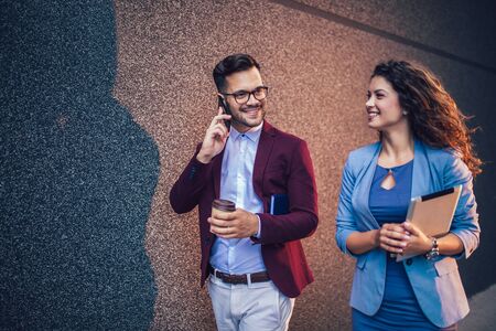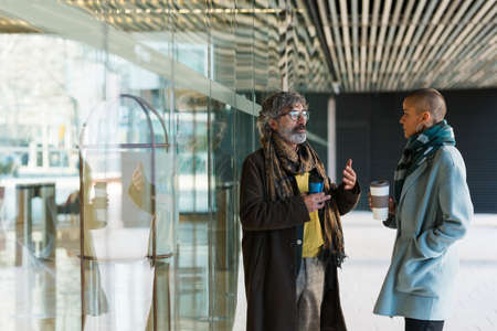 Two business people talking and drinking coffee outside the office building during a break from work.