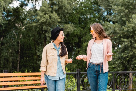 beautiful girls in sunglasses smiling while looking at each other in park