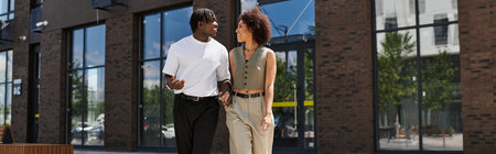 A young african american couple strolls hand in hand, sharing laughs in the city summer sun, banner