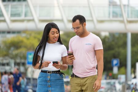 Medium shot of young people using smartphones on street. Two people holding modern phones. Technology concept