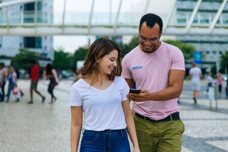 Smiling young couple looking at smartphone. Cheerful people talking and looking at phone during stroll. Technology concept