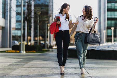 Two attractive smiling businesswoman chatting while walking on their way to work.