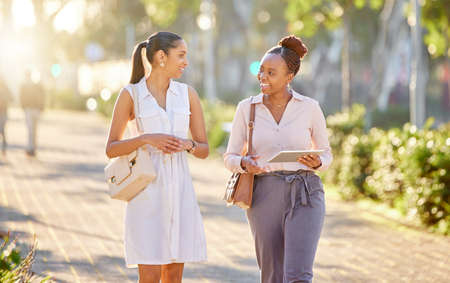 Did you have a good day. Shot of two young businesswomen walking through the city together during their afternoon commute from the office.