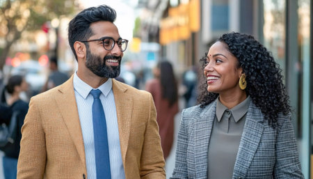 Two business colleagues are happily walking and talking together on a busy city street