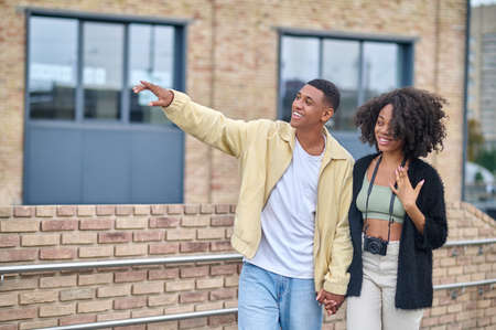 Man pointing with hand and looking contented woman outdoors