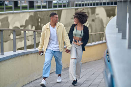 Happy guy and girl walking hand in hand
