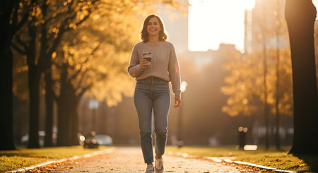 Woman Walking with Coffee on a Sunlit Autumn Path