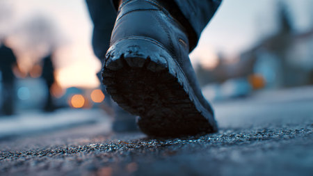 Close-up of a person's shoe while walking. Suitable for accompanying articles about the walking benefits, articles recommending places to walk for exercise, posting pictures with quotes about walking