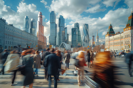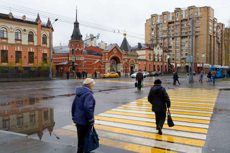 Moscow, Russia - 26 Sep 2020: Pedestrians walking on zebra, people crossing road on crosswalk, crowd on street, urban downtown traffic. Moscow city highrise towers or skyscrapers. Ped xing perspective