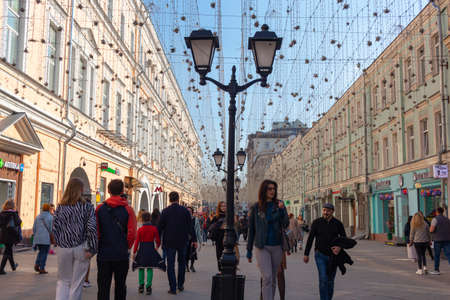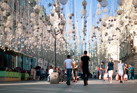 View of the pedestrian street in the center of the capital of Russia. City walking street decorated with white lanterns. Moscow, Russia - 05.21.2022