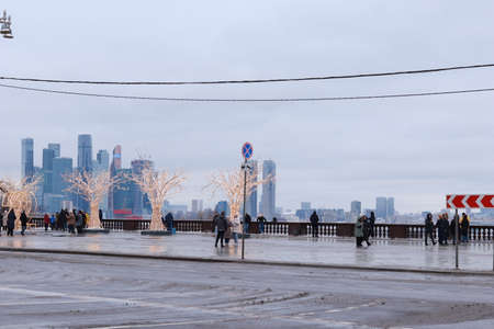 Moscow, Russia, January 1, 2022. Observation deck Vorobyovy gory (Vorobyovy Gory). People are walking, looking at the panorama of the city. A famous tourist place in Moscow.