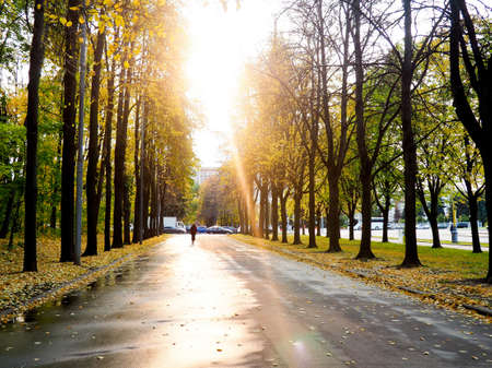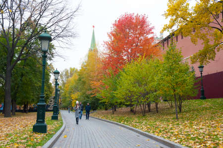 Moscow, Russia - October 14, 2019: Alley in Alexander Garden and Moscow Kremlin in autumn. Alexander Garden and Kremlin are located in center of Moscow.