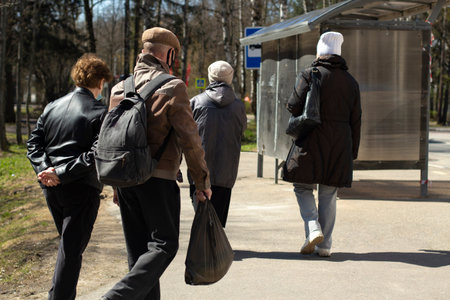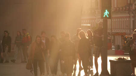 Russia, Saint Petersburg, September 2020.A group of men walking along the street of St. Petersburg, illuminated by the sun. Selective focus. People in the sun haze.