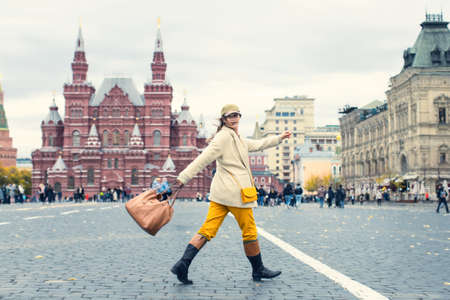 Happy women walking in red coat at the red square in Moscow. Cold time between winter and spring, frost and sun