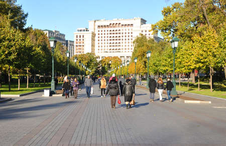 MOSCOW, RUSSIA - July 05, 2018: Tourists walk along the Alexander Garden on Manezh Square in Moscow.