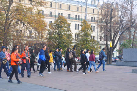 MOSCOW, RUSSIA - OCTOBER 19, 2018: A group of tourists on the street goes for the guide
