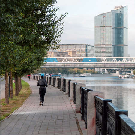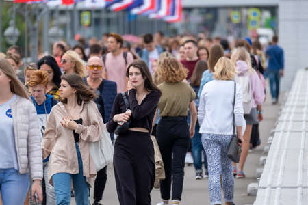 Moscow - September 12, 2020: People of different ages and nationalities walk across the bridge in the city center, summer time