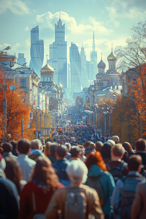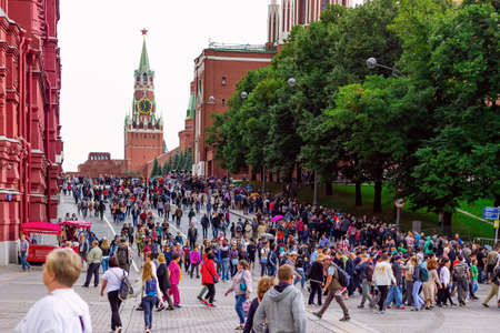 Moscow, Russia - 9 September 2018 : Crowds of walking people, tourists in downtown of Moscow near Red Square at Celebration Day of the city, 871 year Anniversary.