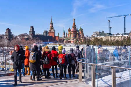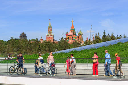 Moscow, Russia - June 03, 2018: Walking tourists in Zaryadye Park on the background of Moscow Kremlin and St. Basil's Cathedral