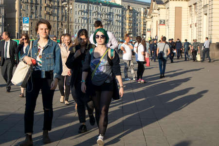 Moscow, RUSSIA - MAY 15, 2018: People are walking around evening Moscow at sunset