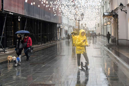 MOSCOW, RUSSIA - September 12, 2021: Stoleshnikov Lane. A food delivery man in a yellow jacket looks at his phone. Two women are walking with a dog. Rainy day.