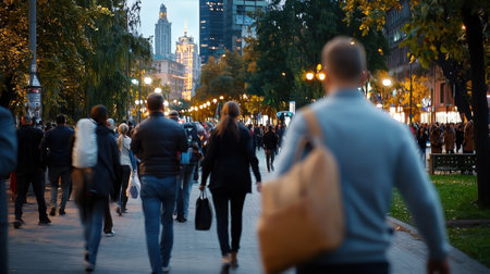 A blurred crowd of business people in the streets of the business district of the city against the backdrop of skyscrapers. Fast-paced streets, aspirations blur.