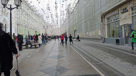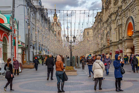 MOSCOW, RUSSIA - March 09, 2019. People walking on famous Nikolskaya street decorated with light bulbs. Wall of Main Department Store (GUM).