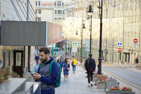People on Nikolskaya street in the center of Moscow. Tourists in the city center. Festive Moscow. Tourists walking on St. Nicholas.