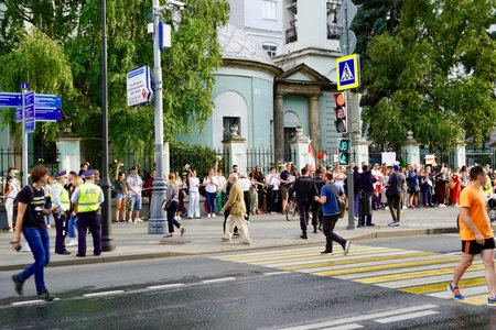 Moscow, Russia - August 2020: Peaceful rally at the Embassy of Belarus in Moscow in support of the Belarusian people.
