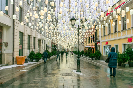 Moscow, Russia - December, 2020: Beautiful alley decorated with garlands. Action. Pedestrian alley glows brightly with white garlands of lanterns on cloudy day. Lively tourist alley decorated with garlands.