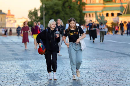Two girls are walking on red square, summer evening. Russia Moscow June 2020.