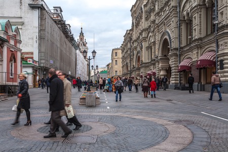Moscow, Russia, April 11, 2019: Rozhdestvenka street near Kuznetsky most subway station. Pedestrian zone. People walking