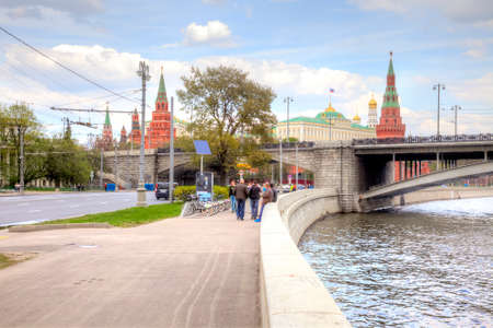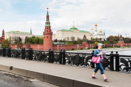 Moscow, Russia - May 2, 2016: Tourists and citizens on the background of Moscow Kremlin. View from the Big Stone Bridge on the Kremlin fortress, Russia. Focus on the Kremlin