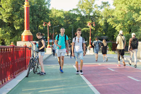 Kyiv UA, 31-07-2019. Young active people walking on a sunny summer day, lifestyle youth, background foot bridge over the river