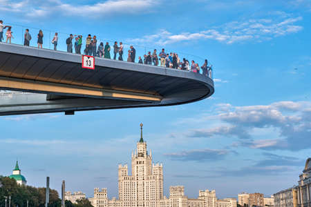Moscow - July 26, 2019: The soaring bridge with people above Moscow river in the park Zaryadye near Moscow Kremlin. Landscape with blue sky background.