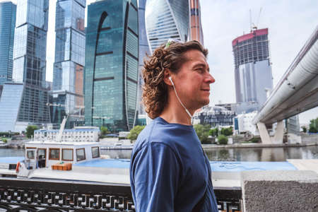 Portrait of man in the city on the background of large buildings complex Moscow-city, skyscrapers in the center of Moscow, Russia.