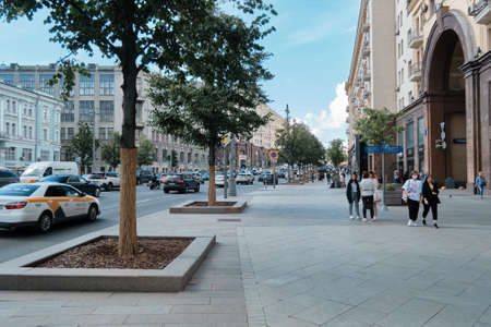 Moscow, Russia - 23 Jul 2020: General landscape view at tradition Moscow architecture. City life on the central streets of the city. The citizens go on their own business. Automobile traffic.
