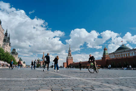 Moscow, Russia - July 28, 2019: Tourists from different countries walking on Red square in Moscow at sunny summer morning against Saint Basil Cathedral