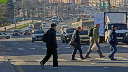 MOSCOW, RUSSIA - MAY 15, 2021. People crossing busy street on the crosswalk in the evening