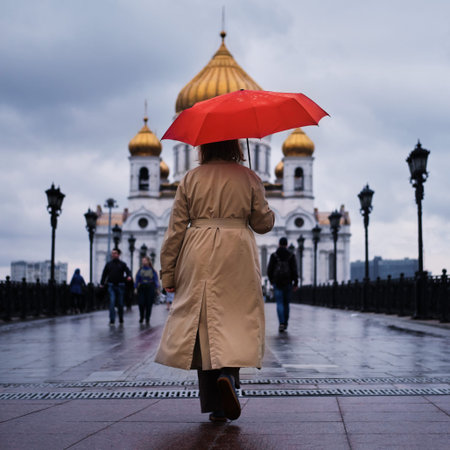 An adult woman with a red umbrella goes to the Cathedral of Christ the Savior